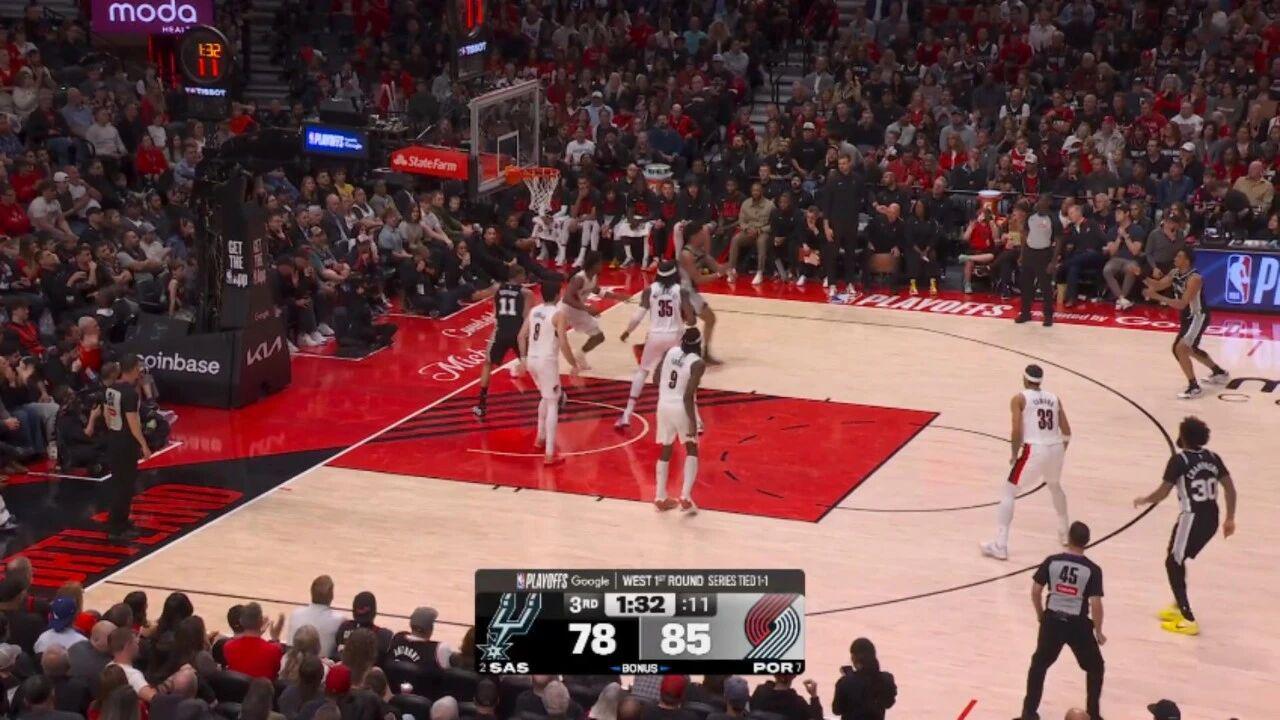 第三节剩下7分钟前,马刺一度64-77落后开拓者,然后哈珀被派上场,并且改变了场上局势:
