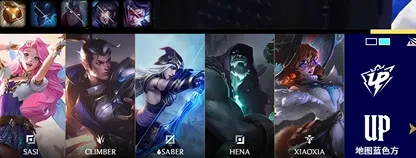UP选用:Sasi掘墓,climber赵信,Saber阿萝拉,Hena寒冰,Xiaoxia萨勒芬妮